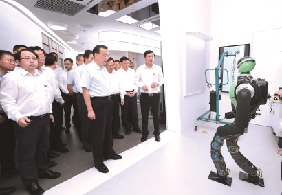 上海电气是年营业收入超过千亿元的综合性装备制造企业。李克强来到这里了解当前经济形势对市场主体的影响,对企业研发生产的重大装备走在国际国内前列表示赞许。他勉励企业瞄准世界一流、更加积极地到国际市场竞争,争创奇迹,展现更强雄风,为提升我国重大装备制造水平、助力经济发展和民生改善多作贡献。李克强来到张江人工智能岛,察看3D视觉远程医疗、智能神经仿生、智能无人系列技术等创新成果。他说,人工智能就是要把人的智慧汇聚起来,更好地为人服务。要注重基础研究,发展热门产业也需要有甘坐冷板凳的人。要加强协同合作,把成果广泛应用到制造业、服务业等领域,培育壮大新动能,造福人民。