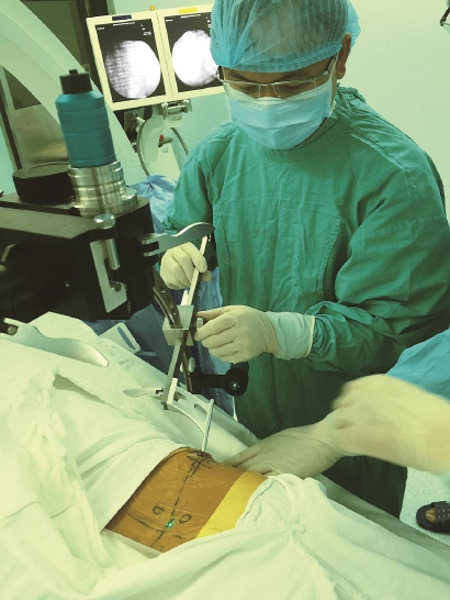 上海市第十人民医院脊柱外科医生正在调试自主发明的定位装置。 (上海市第十人民医院供图)