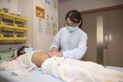 周清为患儿腹膜透析导管出口处换药。 (复旦大学附属儿科医院供图)