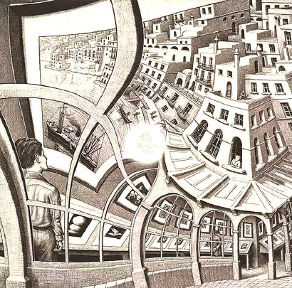 旋转楼梯是艾舍尔作品中反复出现的意象,循环往复,像是永远没有尽头。《上升与下降》就是其中一幅名作。画面描绘的是一个特别的建筑体:屋顶被一圈封闭的楼梯围住,楼梯上有群人绕着阶梯走,一部分人看上去像是以顺时针的方向往楼梯上走,另一部分人则像是朝逆时针的方向前进,这个楼梯就像一个无止尽的迷宫,一旦进去就无法出来。这样的画“拿来”了著名的“彭罗斯阶梯”原理——那是一个不论向上或是向下皆无限循环的阶梯,观者无法找到最高点与最低点,人们一直在沿着台阶往上走,却一直在同一个水平面上打转转。这样的阶梯现实中的三维世界不可能出现,只可能存在于二维图画的迷惑中,而艾舍尔正发挥其丰沛的想像力与缜密的计算,让彭罗斯阶梯逼真、合理地出现在自己的画中。再看艾舍尔的另一幅名作《艺术画廊》,尽管画面并未出现阶梯本身,但内核其实仍是旋转楼梯般的意象。据说画家本人十分钟爱这幅作品,他曾多次于书信中向朋友解释:“这幅画作透过循环排列以及球面突起效果,产生一种既无开始也无结束的画面。我故意选择了连续的物体来变化,例如画廊中的一排画、或是小镇的一排房子,如果不是这样,观众就难以理解我创作此幅作品的意图。”
