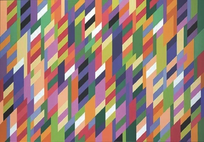 赖利是欧普艺术的代表人物。欧普艺术又名视幻艺术,主要借助线、形、色的特殊排列引起人们的视错觉,从而使静止的画面产生眩目流动的动感效果。而赖利最为标志性的创作风格,便是将波浪状的色彩条带并置,在画布的平面上形成强烈的视觉观感。凝视着她的画作,不一会儿观者便会觉得头昏目眩。艺术评论家称,她的画淋漓尽致地展示了光效应的奥秘。