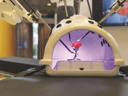 在医生操纵下,机器人手术机械臂完成摘花瓣等精细操作。 唐闻佳摄