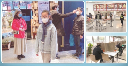 图①:顾客进入商场需排队接受测温。图②:超市在重点区域设置“一米线”引导消费者单进单出、安排专人巡场警示顾客注意安全。(均资料照片)图③:食堂在每张餐桌上安置了交叉的隔离板,让员工在“格子间”内用餐。 本报记者 单颖文摄 制图:冯晓瑜