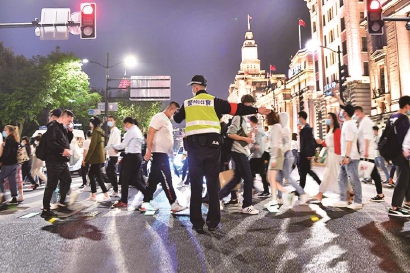 上图:黄浦公安分局民警在外滩风景区维持秩序。本报记者 赵立荣摄