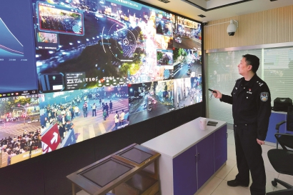 右图:黄浦公安分局通过可视化平台指挥系统实时观察外滩风景区客流变化。 均本报记者 赵立荣摄