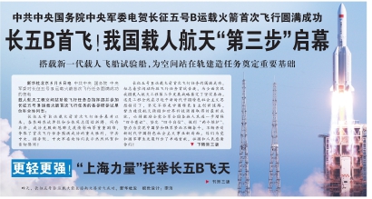 据新华社海南文昌5月5日电 (李国利 肖建军)为我国载人空间站工程研制的长征五号B运载火箭5日在海南文昌首飞成功,正式拉开我国载人航天工程“第三步”任务的序幕。
