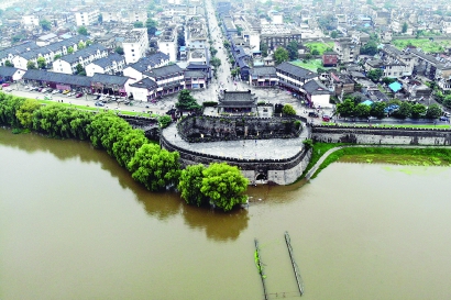 受近日强降雨影响,安徽省寿县古城护城河河水暴涨,为防止河水倒灌进城内,寿县防汛抗旱指挥部决定从7月18日12时起封堵县城宾阳门。图为寿县县城宾阳门(无人机照片)。 新华社记者 黄博涵摄