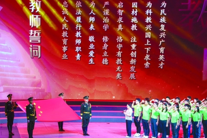 ◆中国工程院院士闻玉梅带领新入职教师代表们庄严宣誓。 本报记者 袁婧摄