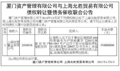 厦门资产管理有限公司与上海允胜贸易有限公司债权转让暨债务催收联合公告