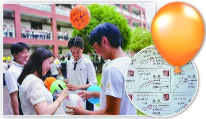 上海师范大学附属经纬实验学校举办了特别的祝福活动:放飞300只写有毕业生考试心愿的彩色气球。 浦东新区新云台中学校长王晓云为每位学生私人定制的明信片。 制图:冯晓瑜