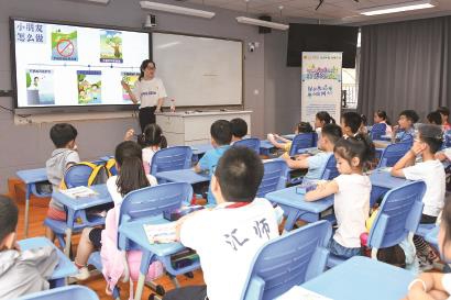 今年,爱心暑托班继续整合多方优质资源进行“组团式”服务。市级统一配送了“德、智、体、美、劳”五大类别的课程。各个区在课程设计上也各有特色:长宁区形成“一街一特”的课程特色,每个办班点推出一种特色课程;虹口区以“讲授、问题探究、训练与实践”三大类板块,开展爱国主义教育、手工非遗技艺、体育运动健身等课程;静安区开设沪上文化课程“沪语小达人”,通过教学生们说地道的上海话,了解老上海的变迁和上海红色故事;宝山区定制配送了500余节课程;松江区设立“爱暑爱阅读”爱心读书角、 “爱暑爱戏剧”美育进课堂等。