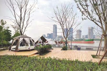 在沿着江边的绿地上搭一顶帐篷,或坐或躺,惬意地吹吹江风、欣赏江景——很多市民都有这样的心愿,以往因可能损坏绿化而很难遂愿。现在,整个耀华滨江绿地利用穿行的木栈道补充步行体系,用木平台拓展、提供搭帐篷的场地,增强了游赏体验。目前,这里新增的架空木平台及栈道面积约7200平方米,可容纳200顶常规帐篷,周边配以湿地、地被花海景观,既避免对原有绿化的破坏,又满足游客穿林越草、搭建帐篷休憩的需求。