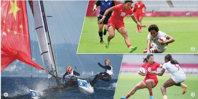 ①:胡笑笑和搭档杨学哲扬帆逐浪。②③:谷瑶瑶(10号)、刘潇倩(8号)在橄榄球比赛中。 图片来源:视觉中国 新华社 制图:李洁