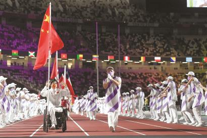 9月5日,第16届夏季残疾人奥林匹克运动会闭幕式在日本东京举行。这是中国体育代表团旗手张雪梅(前左)入场。新华社记者张金加摄