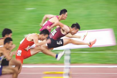 顶住重压,谢文骏在全运会110米栏赛场成就三连冠。 本报记者 陈龙摄