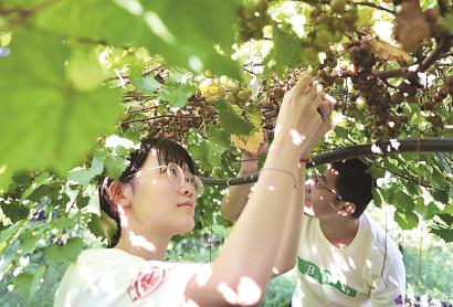 上海交大农业与生物学院的学生们亲手采摘自己栽种的葡萄。