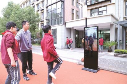 另一头的操场上,佩戴运动手环的八年级学生在进行50米跑测试,学生们对着操场上的体锻屏和体测屏进行运动。体育教师马秋婷享受着技术带来的教学便利:“原本为了50米测试,一名教师要同时为四个学生记录成绩,难免不够严谨,如今技术升级后,教师能够通过大屏幕准确了解每个学生的跑步成绩,之后给予更有针对性的指导。”