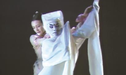 男:(似自语又似对观众)无光、无象、无音、无色的混沌给了我,一个我、四个我、七个我、十个我。我,嗯——又不是我,是他(指脚边的一堆骷颅),是你(指观众,然后连忙摇手)不,不是你。(在地上捡起一骷髅,放在脸前)不是他。(移开骷髅)是我,混沌给了我!