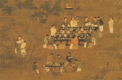 唐代诗人钱起有一首《与赵莒茶宴》诗:“竹下忘言对紫茶,全胜羽客醉流霞。尘心洗尽兴难尽,一树蝉声片影斜。”所谓“茶宴”,是以茶代酒来宴请宾客。从“竹下忘言”、“一树蝉声”两句来看,赵莒的茶宴举办,大概在盛夏的茂林修竹之中。其中,宴会上品的紫茶,在唐代饮茶风尚中被视为上品,陆羽在《茶经》卷上也曾言,茶以“紫者上”,而“绿者次”。清风徐来、树影婆娑,三五好友寤坐清谈,比之于“竹林七贤”的痛饮狂啸,更是另一番风味,魏晋文人通过吃药喝酒入迷狂,唐宋之士则以品茗之清雅为尚。