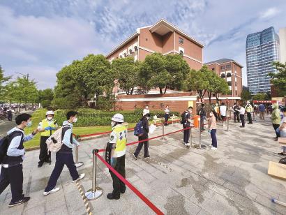 南洋中学的同学们有序排队完成消毒、“数字哨兵”绿码等查验步骤,依次进入学校,重聚在久违的美丽校园。本报记者 袁婧摄