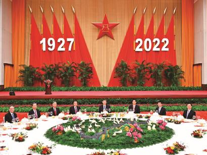 人民大会堂宴会厅灯火璀璨,洋溢着热烈喜庆的节日气氛。主席台上方悬挂着庄严的“八一”军徽,“1927-2022”的大字年号在红旗映衬下格外醒目,昭示着中国人民解放军走过95年的光辉历程。