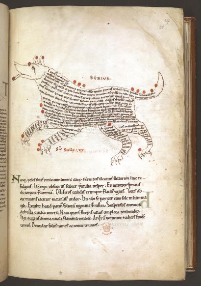 这页大犬座(Canis Major)图出自一份12世纪手抄本。手抄本中包含西塞罗的《阿剌托斯集》(Aratea)。西塞罗以拉丁文翻译了古希腊诗人阿拉图斯的《天象》(Phaenomena),而《天象》则是对哲学家欧多克索斯的天文学著作的韵文改写。