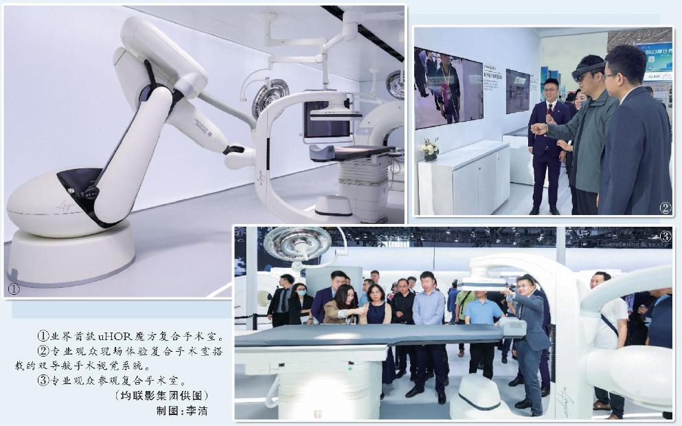 ①业界首款uHOR魔方复合手术室。②专业观众现场体验复合手术室搭载的双导航手术视觉系统。③专业观众参观复合手术室。(均联影集团供图)制图:李洁