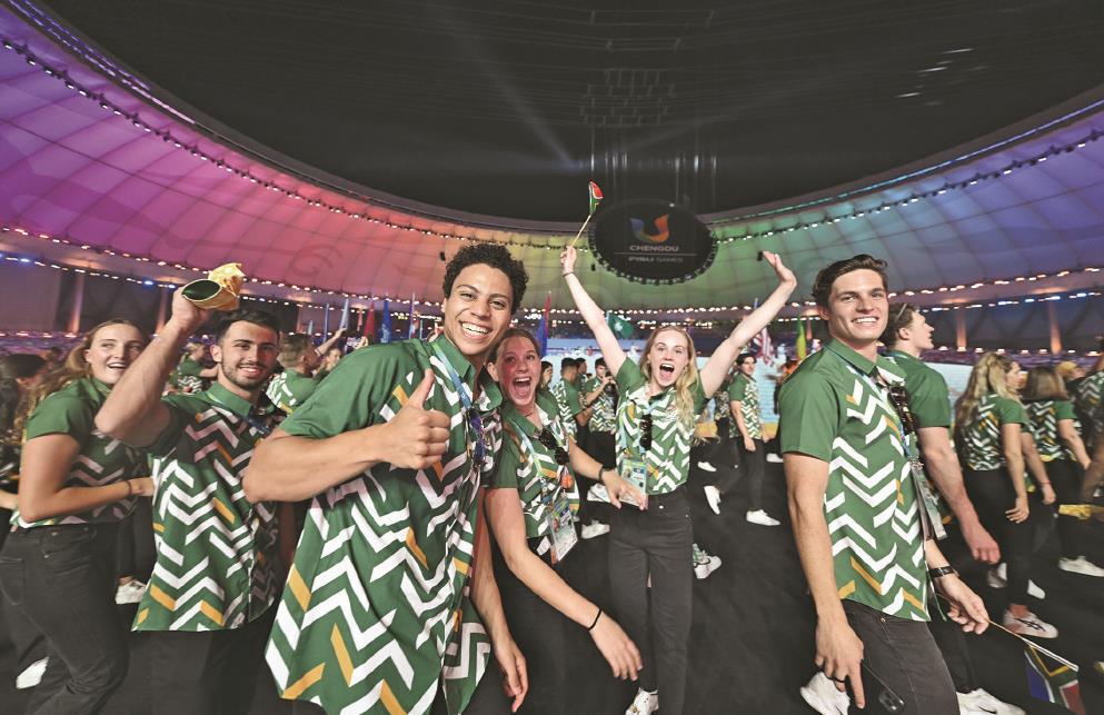 各方宾客盛赞成都大运会,南非代表团成员在入场仪式上竖起大拇指。 新华社发