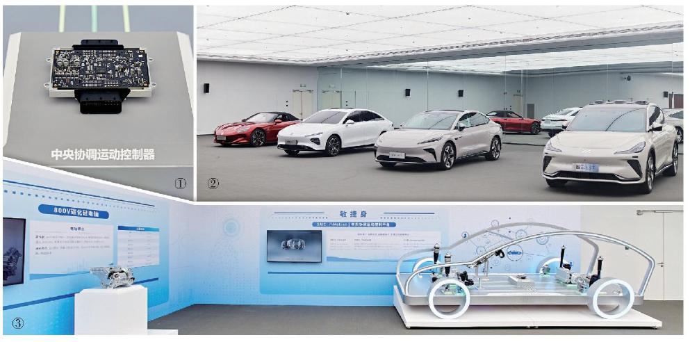 ①中央协调运动控制器承担着汽车“小脑”的功能。②上汽集团旗下新车。③“敏捷身”中央协调运动控制平台。(均采访对象供图)制图:李洁