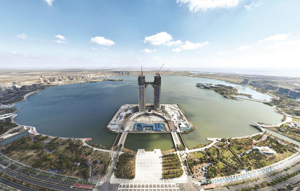近日,临港西岛中银金融中心项目钢结构锥体提升完成,南北两座塔楼成功“牵手”。 新华社记者 方喆摄