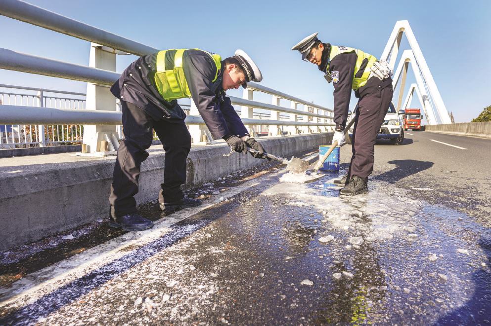 昨天一早,崇明公安分局民警在铲除桥面上的积冰。 本报记者 赵立荣 通讯员 李辉摄