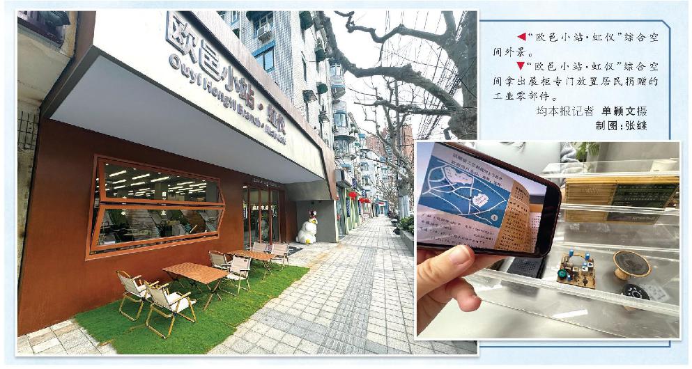 “欧邑小站·虹仪”综合空间外景。 “欧邑小站·虹仪”综合空间拿出展柜专门放置居民捐赠的工业零部件。均本报记者 单颖文摄 制图:张继