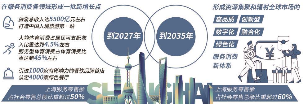《实施方案》提出明确的发展目标,围绕上海国际消费中心城市建设总体目标,以市场驱动、标准对接、制度创新为引领,推动上海成为服务消费的品牌资源汇聚地、模式创新策源地和消费潮流风向标,将上海打造成为国内领先、国际一流的服务消费标杆城市。同时,《实施方案》也给出了十分具体的数字目标:到2027年、2035年,上海服务零售额占社会零售总额的比重分别超过50%、60%。