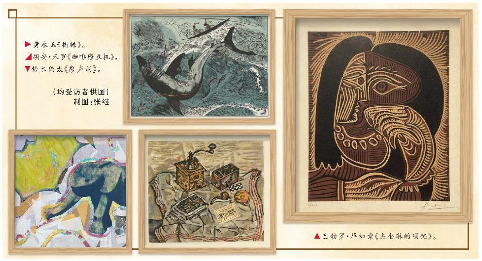 黄永玉《捕鲸》。胡安·米罗《咖啡磨豆机》。铃木隆太《象声词》。巴勃罗·毕加索《杰奎琳的项链》。(均受访者供图)制图:张继