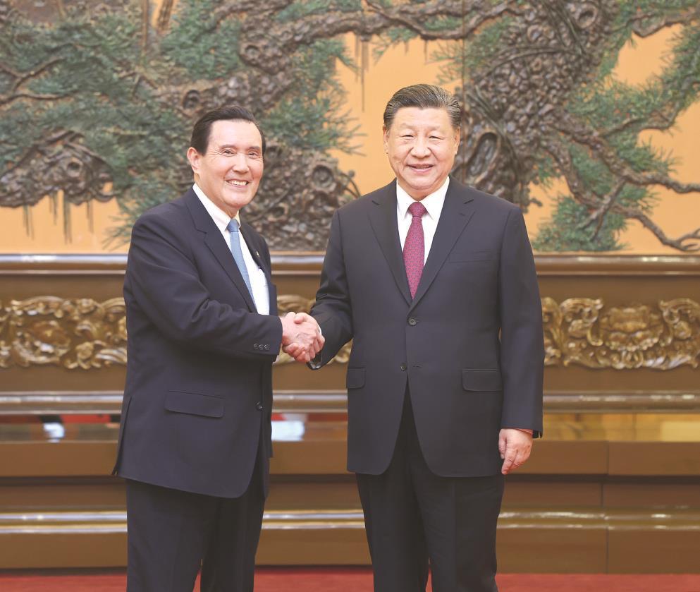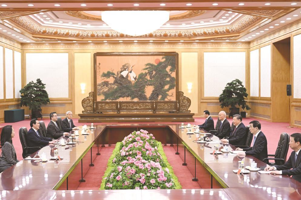 左图:4月10日下午,中共中央总书记习近平在北京会见马英九一行。新华社记者 鞠 鹏摄