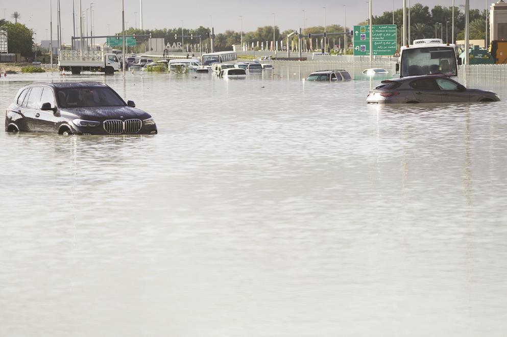 阿联酋国家气象中心17日确认,该国过去24小时内遭遇1949年有记录以来最强降雨。在迪拜,16日一天的降雨量相当于当地平均一年半到两年的雨量。另据阿联酋当地媒体报道,此次强降雨已导致1人死亡。图为当天在迪拜,车辆被积水浸泡。 新华社发