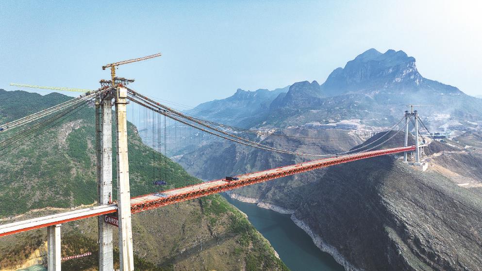 4月28日,随着最后一段钢桁梁吊装到预定位置,贵州交建集团投资建设的纳晴高速牂牁江大桥顺利实现合龙,为纳(雍)晴(隆)高速全线建成通车打下坚实基础。 新华社记者 陶亮摄