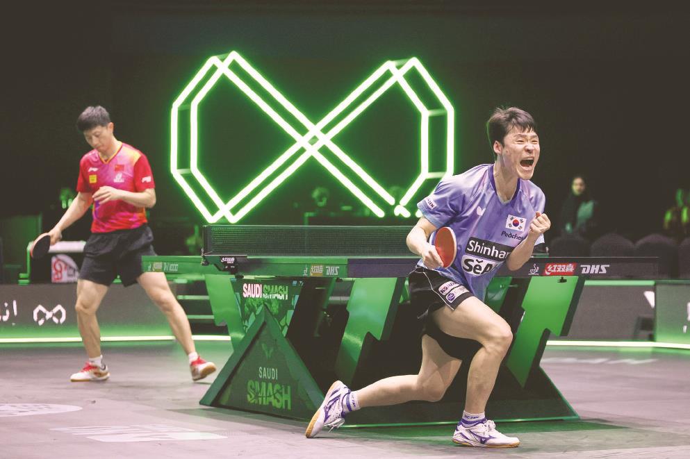 马龙(左)在WTT沙特大满贯不敌韩国名将张禹珍后,他落选奥运会男单名单并不意外。 视觉中国