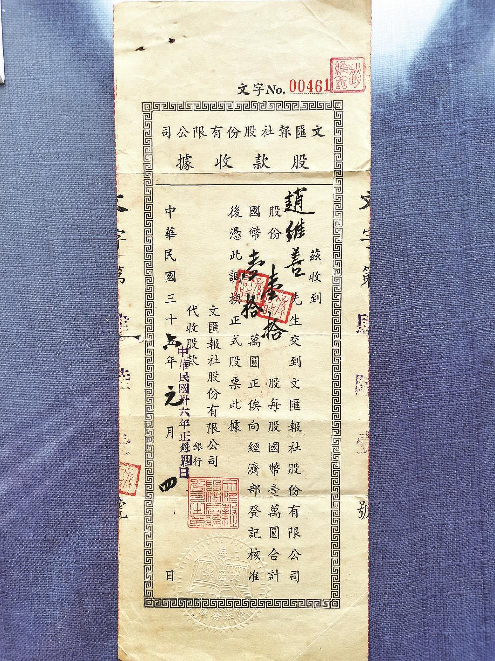 吴福明捐赠的1947年文汇报社股款收据。 (馆方供图)