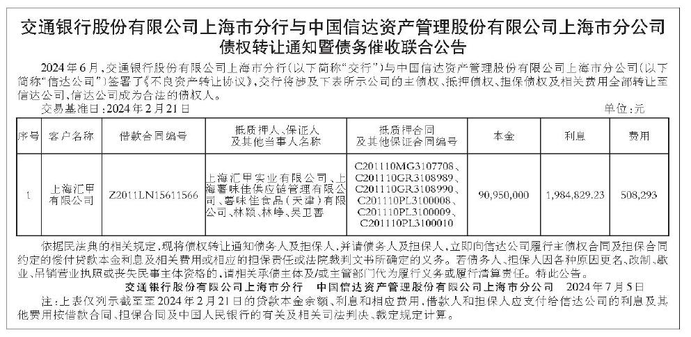 交通银行股份有限公司上海市分行与中国信达资产管理股份有限公司上海市分公司 债权转让通知暨债务催收联合公告