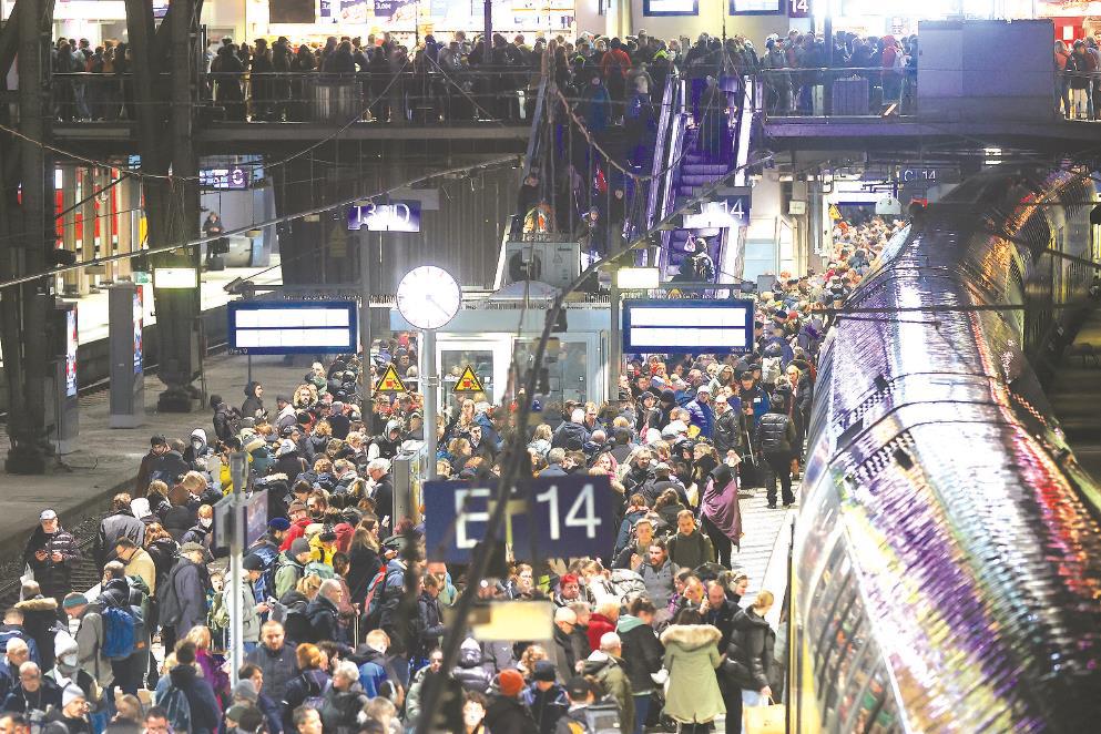 当地时间2023年12月21日,德国汉堡,风暴“佐尔坦”导致德国铁路列车大面积延误,许多旅客在站台上等待火车。 视觉中国
