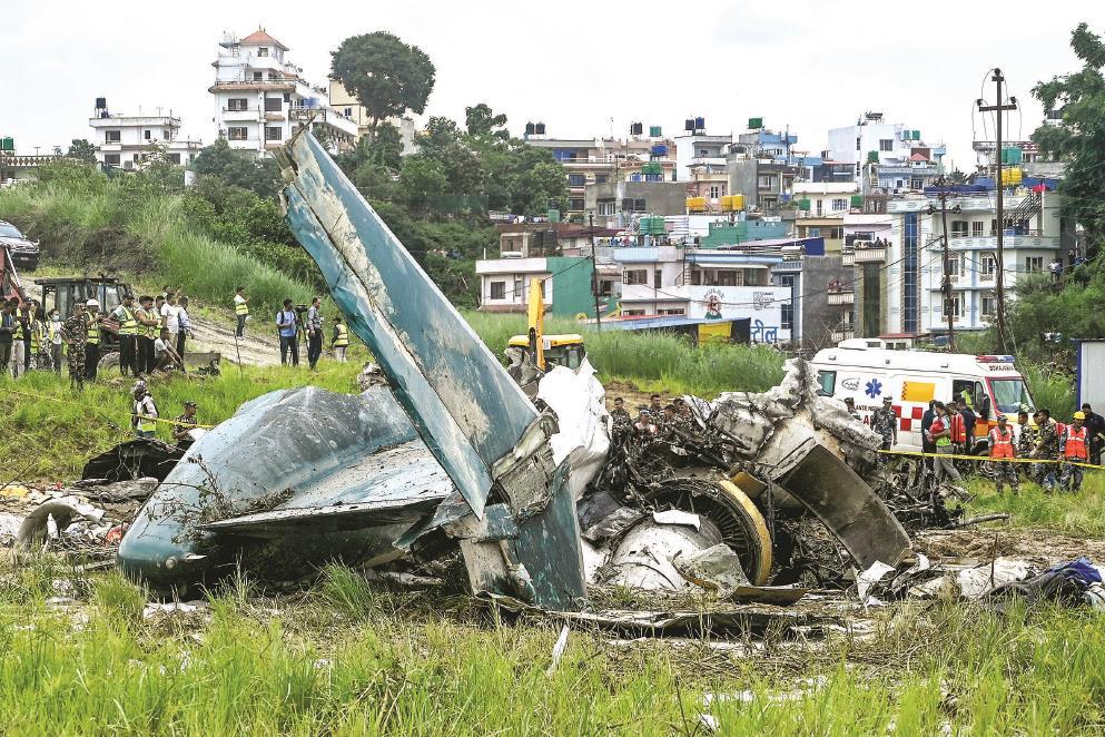 7月24日,在尼泊尔加德满都特里布万机场,工作人员查看事故现场。新华社发