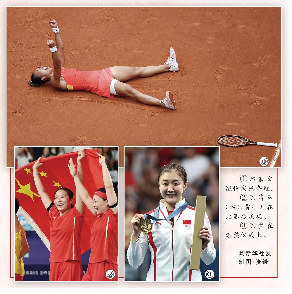 ①郑钦文激情庆祝夺冠。②陈清晨(右)/贾一凡在比赛后庆祝。③陈梦在颁奖仪式上。 均新华社发 制图:张继