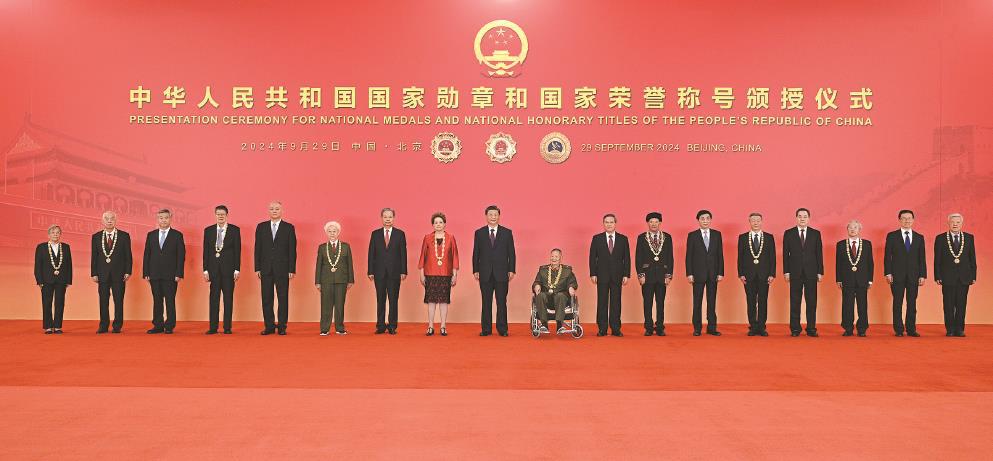 9月29日,中华人民共和国国家勋章和国家荣誉称号颁授仪式在北京人民大会堂金色大厅隆重举行。中共中央总书记、国家主席、中央军委主席习近平向国家勋章和国家荣誉称号获得者颁授勋章奖章并发表重要讲话。 新华社记者 鞠鹏摄