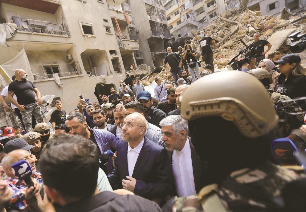 10月12日,伊朗议长卡利巴夫(中左)到访黎巴嫩贝鲁特市中心最近遭以色列空袭的地点。 新华社发