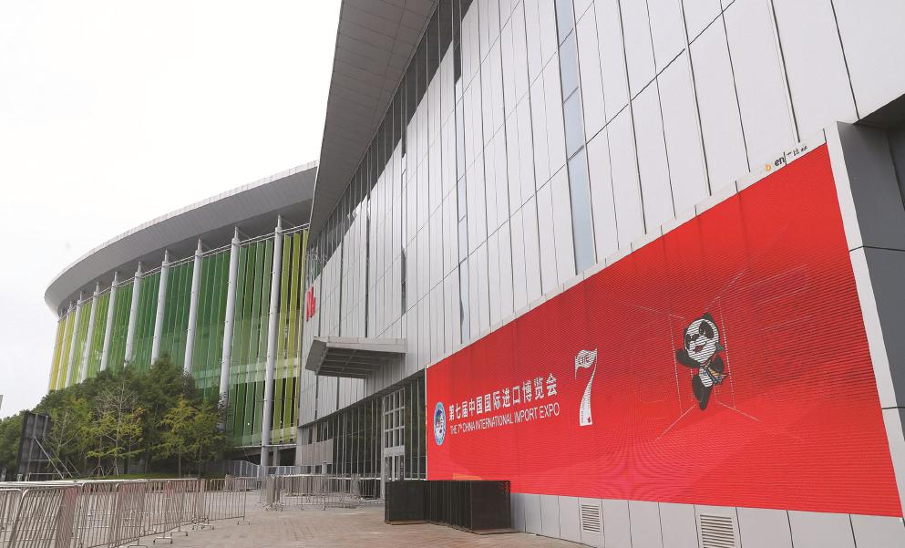 国家会展中心(上海)北入口处屏幕上的进博会主题宣传画面。 新华社发