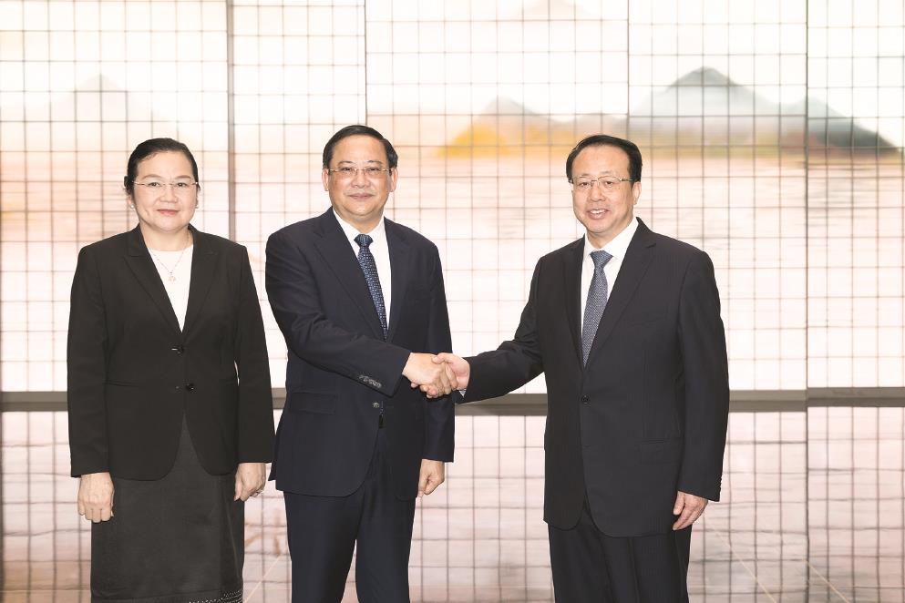 老挝驻华大使宋蓬,中国驻老挝大使方虹,上海市副市长华源参加会见。