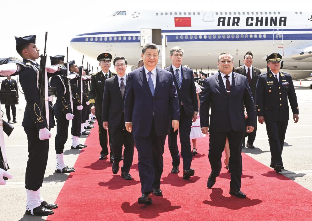 习近平乘专机抵达利马卡亚俄空军基地时,秘鲁部长会议主席阿德里安森等高级官员热情迎接。当地学生向习近平献花,用中文对习近平到访表示热烈欢迎。礼兵分列红毯两侧致敬。