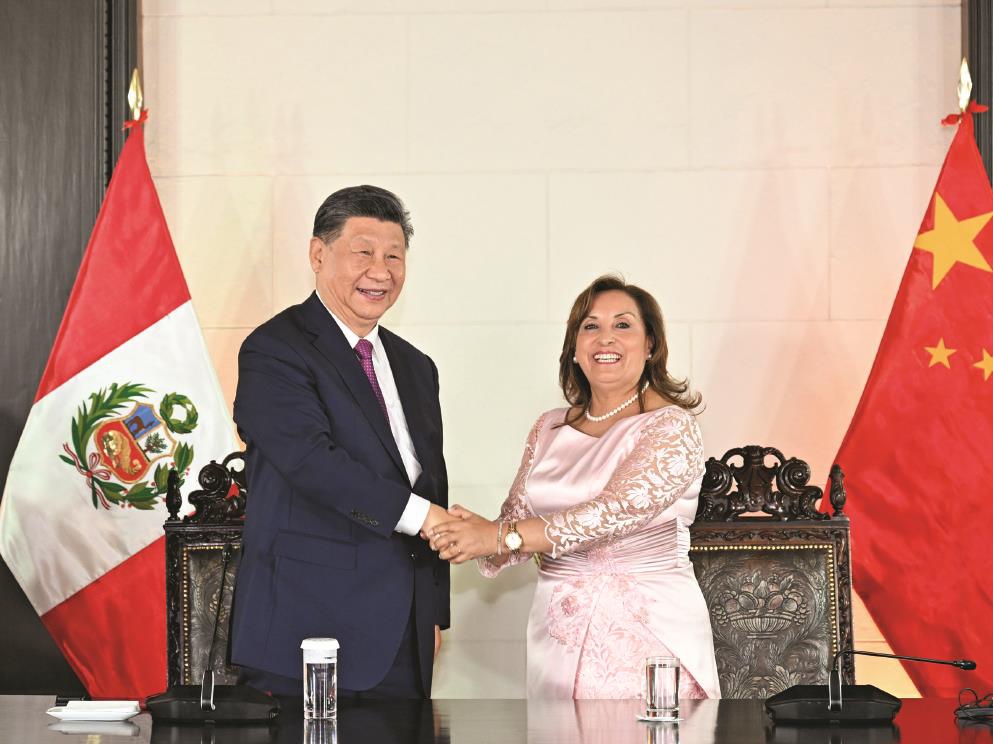 习近平指出,双方要对接发展战略,深挖合作潜力,打造务实合作新格局,加强贸易和投资“双轮驱动”,推动传统产业和新兴产业“两翼齐飞”,促进产业链和供应链“两链融通”。中方愿继续扩大进口秘鲁特色优质农产品,鼓励有实力的中国企业赴秘鲁投资兴业,为当地发展作出应有贡献。双方要统筹推进矿产能源、基础设施、交通通信等传统领域合作,拓展数字经济、人工智能、绿色航运、电动汽车、光伏产业等新兴领域合作。中方愿鼓励中国企业参与秘鲁基础设施建设“硬联通”,推动智慧海关“软联通”。中国企业克服困难如期完成钱凯港项目一期工程,充分表明中方同秘方开展长期战略合作的决心。▼ 下转第二版(上接第一版)中方愿同秘方一道,充分发挥钱凯港区位优势,打造以钱凯港为起点的中拉陆海新通道,探索构建从沿海到内陆、从秘鲁到拉美其他国家的立体、多元、高效互联互通格局,带动拉美和加勒比地区整体发展和一体化建设。中方支持苏州市同钱凯市建立友城关系,愿同秘方开展工业园区建设经验交流,拓展跨境服务贸易、电子商务等领域合作,发挥集群效应和联动效应,用更多务实成果坚定中秘长期友好互利合作的信心。中方也愿结合秘方发展需求,就近设立鲁班工坊、中文工坊,开展职业教育合作,为秘方提供本土化人才和智力技术支撑。