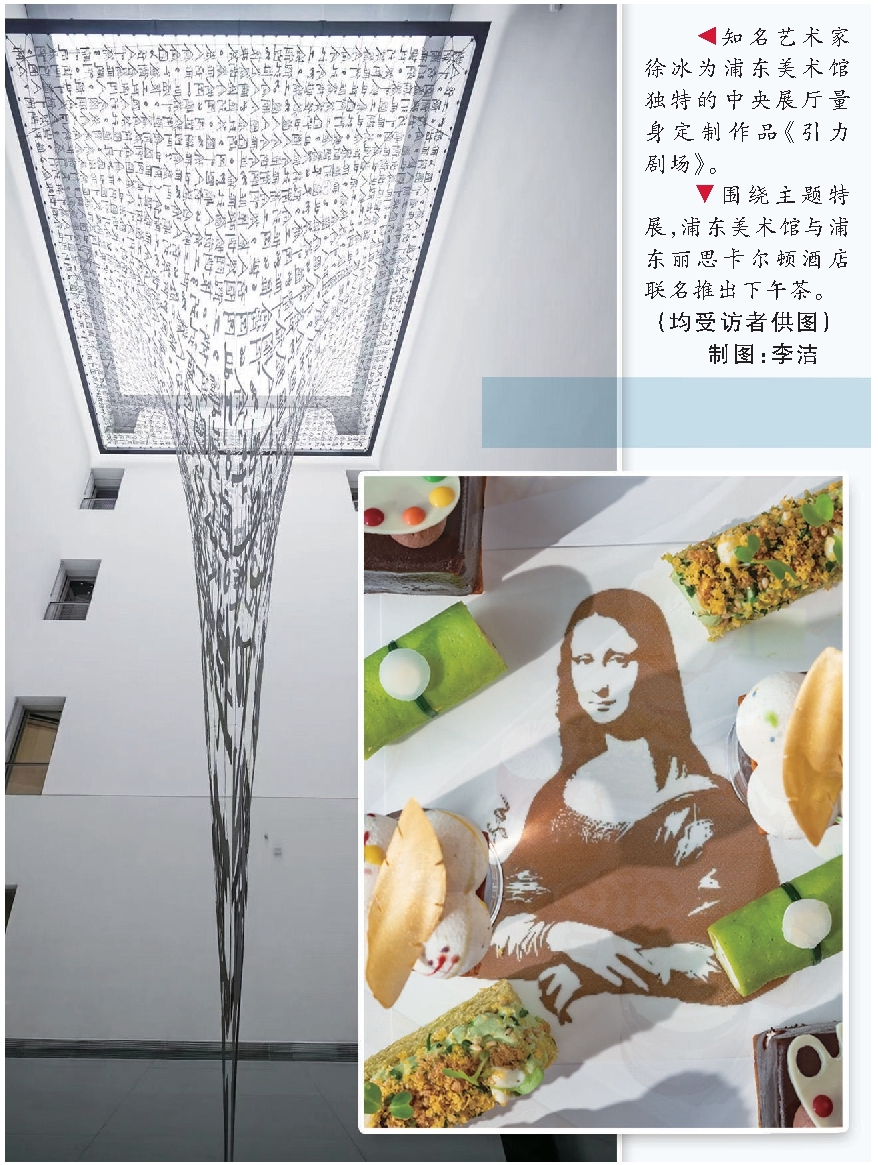 知名艺术家徐冰为浦东美术馆独特的中央展厅量身定制作品《引力剧场》。围绕主题特展,浦东美术馆与浦东丽思卡尔顿酒店联名推出下午茶。(均受访者供图)制图:李洁
